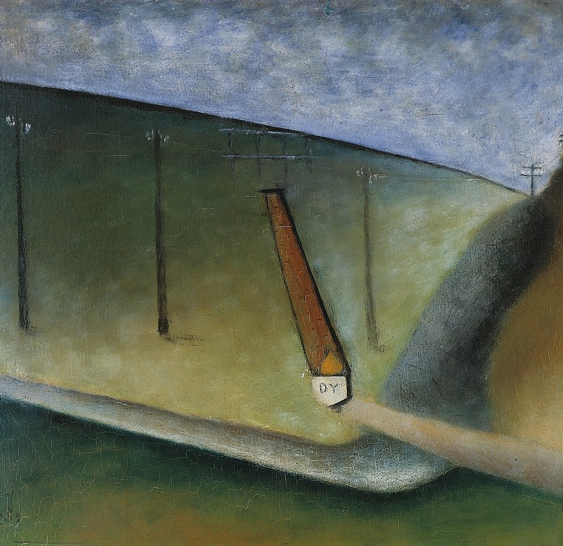 Mogą to być domy, mur, słupy telegraficzne: wszelki pobliski obszar. Chociażby rudy wylot tunelu kolei wśród rozjaśniającej się ku szaremu obrywowi zielonej łąki, na której miarowy rytm wybijają słupy telegraficzne z białymi punkcikami bezpieczników – niby kroplami znikomego dźwięku. U wylotu tunelu, w którym nieświadomy widz widziałby po prostu zwężające się pod pulsującą szarą niebieskością pasmo brązu, wciętego w żółciejszą po prawej stronie zieleń, widnieje drobna biało-żółta forma o prostych zarysach z literami „DY”. Rozpoznanie brązowej formy jako tunelu – tego łącznika między doskonale zamkniętą kompozycją obrazu a rzeczywistym pejzażem – byłoby oczywiście zbędne, gdybyśmy nie upatrywali tu okazji do wejrzenia w sposób, w jaki wizja Spychalskiego transcenduje od doznania oczu do twórczego pojęcia istoty widzianego. Bo wiemy coś o historii obrazu: owa zagadkowa inskrypcja, „DY”, ten wybiegający ku widzowi centralny punkt, to w pierwotnej, dostarczającej malarskiego impulsu, rzeczywistości, ostatnia sylaba słowa „LODY”, napisu na wózku lodziarza, który przy okazji kolejki zwykł był oczekiwać na swoich klientów{3}. I oto, dzięki temu prostemu wtajemniczeniu, na naszych oczach dokonywuje się jak gdyby uniesienie fragmentu przechwyconego ze sfery zmysłowo dostępnej – w sferę abstrakcji – przez odciążenie od nieistotnych malarsko szczegółów, syntezę i nadanie wewnętrznego organicznego tętna temu suwerennemu tworowi: obrazowi noszącemu tytuł „Nad torem do Starołęki” [kat. I, 12]{4}. Panuje w nim przestronna cisza zielonych płaszczyzn i czystych linii – prostych lub wygiętych w łagodne łuki. Rządzi prawo – czyż nie będące formułą poezji? – kondensacji i miary. Eliminowanie wszelkiej niekonieczności zamącającej klarowność związków między elementami, skrót ścisły jak zadzierzgnięcie węzła, zaciśniętego po to, by wizerunek rzeczy dostępnych potocznemu doznaniu objawił się w swojej nieoczekiwanej, pełnej duchowej treści wymowie – są to zabiegi nieodzowne w praktyce poetyckiej.