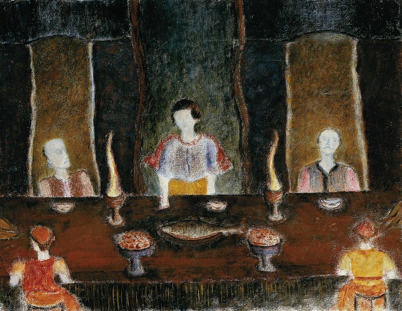 Fascynację postacią starotestamentowego Jakuba można zrozumieć. Któryż z Boskich Wybrańców jest równie ludzki, jak Jakub? Zna on zachwycenie Boską bliskością i żmudną pracą wypełnioną codzienność. Zna osad wstydu po popełnionym oszustwie i gorycz, gdy sam pada ofiarą oszustwa. Zna miłość bardzo człowieczą i zawrotnie ufną miłość do Boga. Bóg silną ręką kieruje jego losem – a jednak Jakub raz po raz sam dokonywuje wyboru. Wokół Jakuba osnuwa się wiele szkiców i obrazów Spychalskiego. Czy „Uczta” [kat. I, 132] i „Kompozycja z namiotem” [kat. I, 142] z 1944 r. zrodziły się z tej właśnie fascynacji? Może odbywająca się w nasyceniu zieleni, brązu, oliwkowych i szafirowych tonów „Uczta”{34} jest tą biesiadą, którą Laban podjął Jakuba uchodzącego przed zemstą brata? Lub też jest to uczta weselna Jakuba, gdy dostaje za żonę Rachelę? Niepewne to są domniemania, bo na inny trop mógłby naprowadzić eucharystyczny charakter tej sceny. Jakiekolwiek jest to ucztowanie, panuje nad nim ścisła symetria, hieratyczny ład rytuału; pośrodku zasiada osoba w niebieskogranatowej narzutce bramowanej czerwienią i gęstą żółcią. Po jej bokach siedzą wpatrzone w nią – czy też wsłuchane – dwie postacie. Na Środku stołu leży ryba, symetrycznie po dwóch stronach płoną krętymi płomieniami kaganki, piętrzą się pełne owoców patery, po przeciwnej stronie stołu zasiada tyłem do widza dwóch biesiadników.