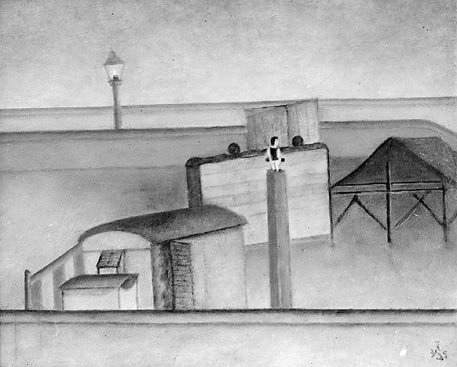 Są wreszcie obrazy – nie tylko te sugerujące literacki bodziec do ich namalowania, nie zawsze łatwy do określenia, jak w wypadku „Kompozycji z namiotem” (kat. I, 142) – które przykuwają uwagę zestawem przedmiotów, skłaniają do poszukiwania swojego znaczenia w nim właśnie, w jego „symbolice”. Należy do nich „Budujący się dom” (kat. I, 76). Tutaj przedmioty, mimo związku z określoną przez tytuł sytuacją, sposobem swojego pojawienia się w obrazie pobudzają potrzebę rozwiązania znaczenia każdego z nich i całego „rebusa”. Inny przykład to „Dziewczęta” (kat. I, 97): zagęszczenie i osobliwość zjawiania się przedmiotów w sąsiedztwie jednej z bohaterek, której tylko głowa widoczna jest w prawym dolnym rogu pola, w konfrontacji z organizacją całości sprawia, że percepcja obrazu zostaje zdominowana przez wciągniecie widza w rozwiązywanie zagadki.